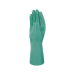 **DESCRIPCIÓN DEL PRODUCTO:** Guante en Nitrilo con interior flocado de algodón. Longitud: 33 cm. Espesor: 0,40 mm. 100% Nitrilo (NBR: caucho de acrilonitrilo-butadieno) Flocado: 100% algodón Estructura relieve sobre palma y dedos: • Antideslizante Interior flocado: • Absorción del sudor • Confort